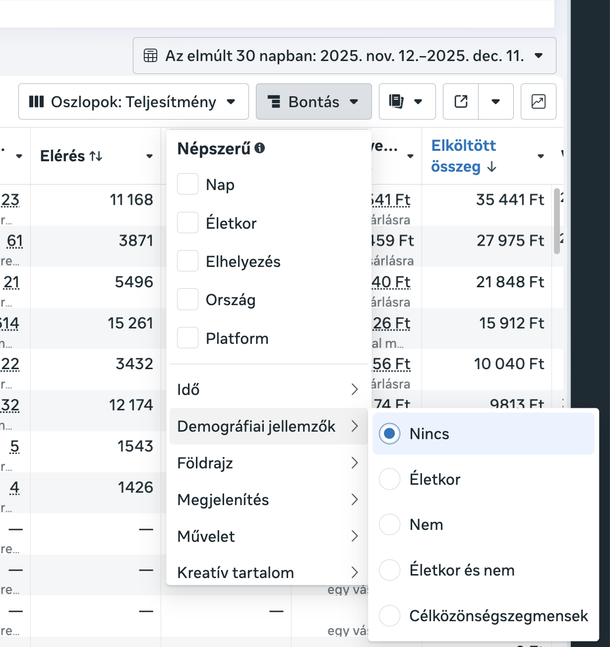 Ha csak összesített adatokat nézünk, elfedjük a valós teljesítmény különbségeket. A bontások segítenek megérteni, hol, kinek és hogyan működik igazán a hirdetésünk.