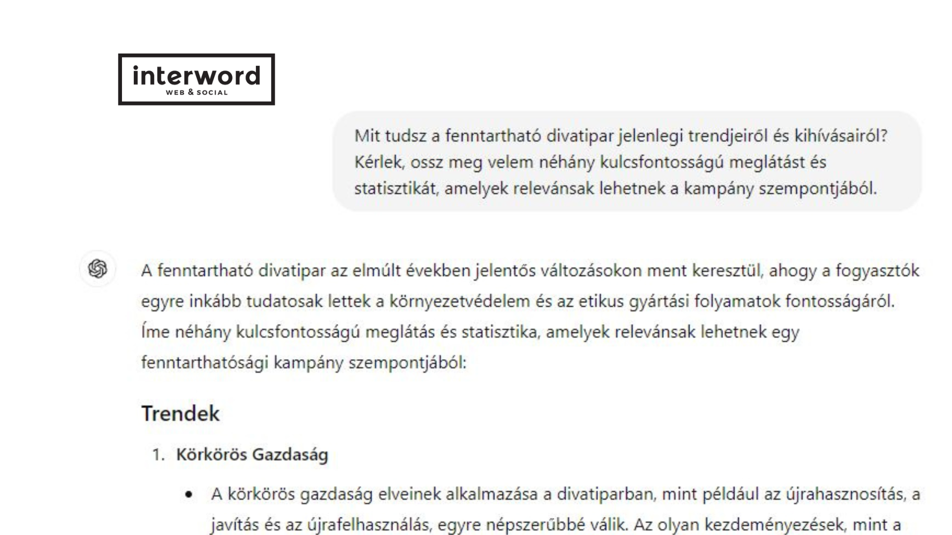 A fenntartható divatra vonatkozó példánkban felülvizsgálhatod az AI alap válaszát, és azonosíthatod azokat a területeket, ahol konkrétabb útmutatást adhatsz, például: