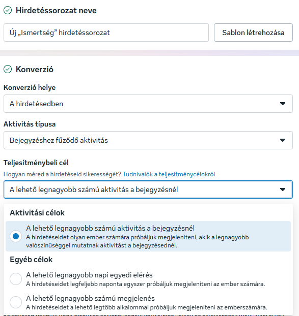 Amikor egy Aktivitás kampányon belül a konverziós helynél a Hirdetés opciót választod, már nem ugyanarra az elköteleződésre optimalizálsz, mint korábban: a Bejegyzéshez fűződő aktivitás mögött ma már jóval szűkebb, tudatosabban válogatott interakciók állnak.